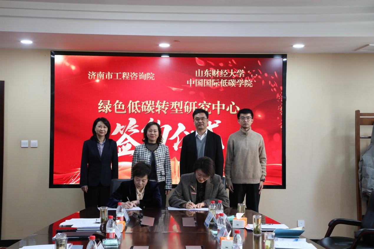 会上,双方围绕 “绿色低碳转型研究中心”未来的目标定位、业务方向和运行模式等内容进行交流探讨。随后,济南市工程咨询院副院长兼总会计师黄健与山东财经大学中国国际低碳学院执行院长王璟珉共同签署“绿色低碳转型研究中心”合作协议。